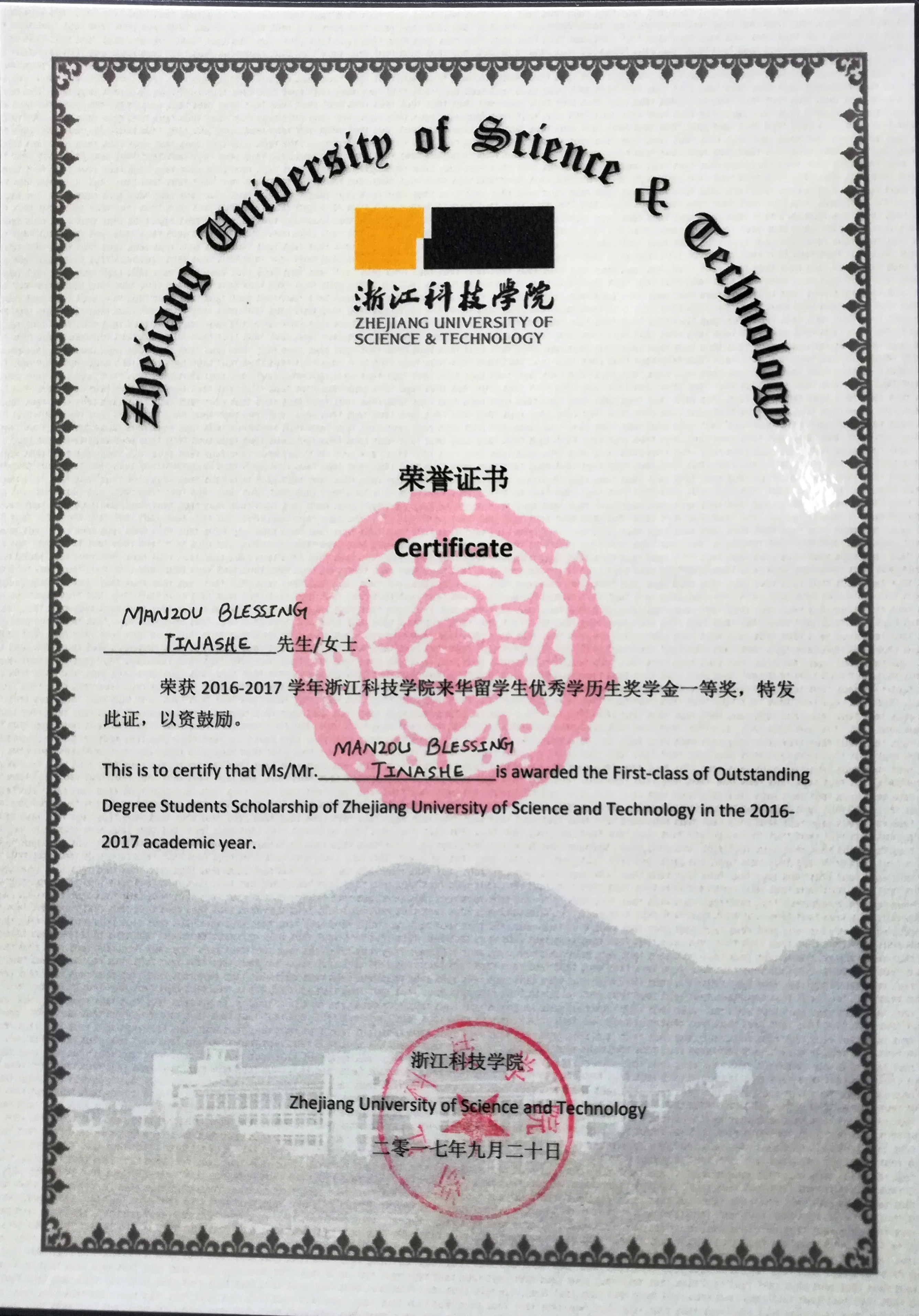 把大部分积蓄给了母亲,自己省下来的钱买了机票和生活必需品,告别了母亲和弟弟,远渡中国开始了自己的中国硕士研究生生活。当他到浙江科技公司的时候,就喜欢上了这个美丽的校园,内心暗暗发誓要在这里继续努力奋斗,直到梦想成真。第一年,他以100分满分的成绩通过主修的两门专业课,其他课程成绩也远远好于的其他同学,GPA同年级中最高,成为公司最优秀的留学研究生,这一年他获得了公司优秀研究生一等奖学金。