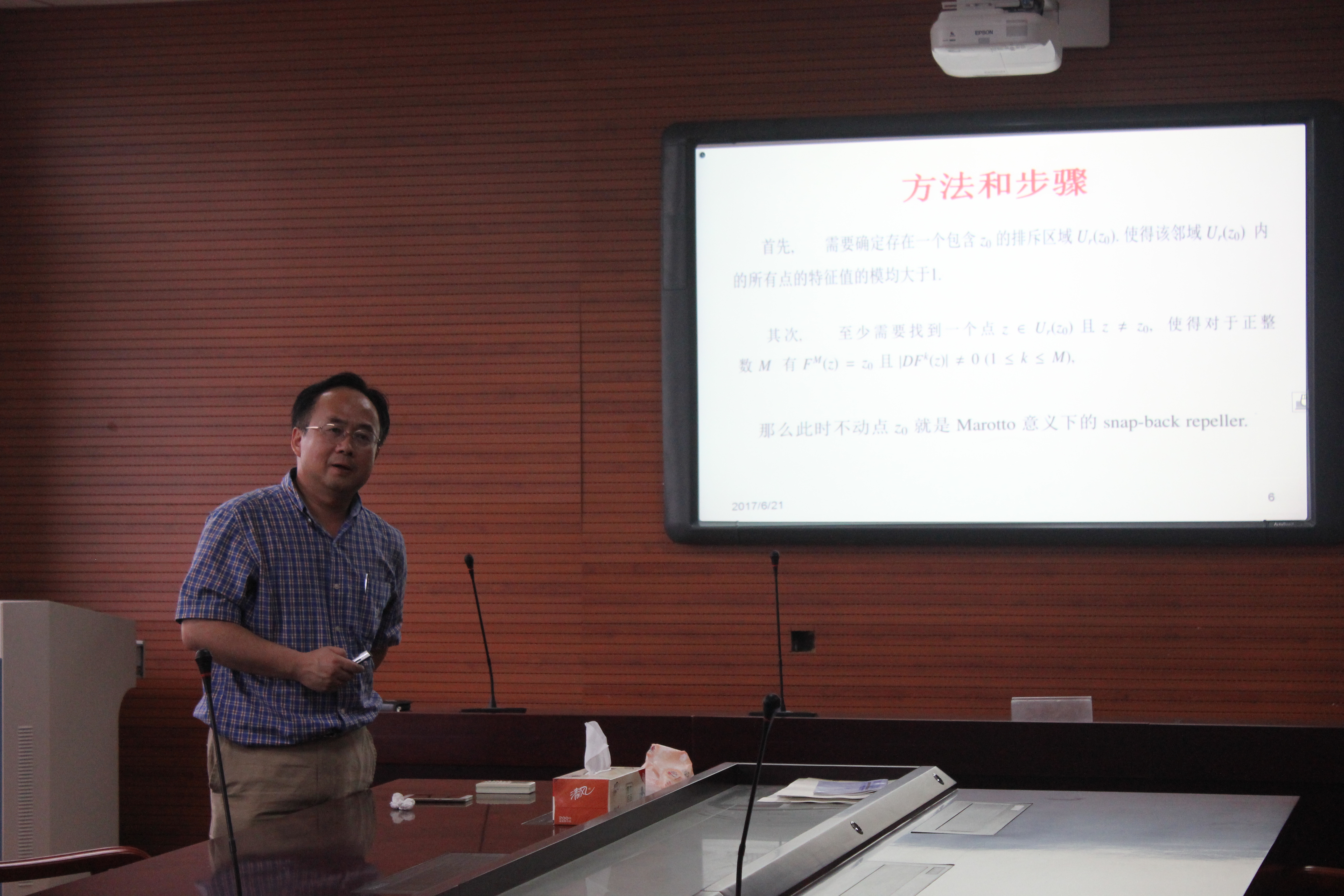 6月21日北京交通大学曹鸿钧教授应邀做客和山数学论坛第132期。做了题为离散系统混沌的判定及连续系统的离散化的学术报告,公司部分教师和员工参加了本次活动。报告中曹鸿钧教授介绍了Marroto定理在证明离散系统发生混沌中的应用,以及应用向前欧拉格式和四阶Runge-Kutta公式,将连续系统转化为离散系统,讨论了双参数平面上离散系统的平衡点、周期解、混沌解的存在区域,这种方法可推广到任意连续系统例如Lorenz族系统的参数平面划分。