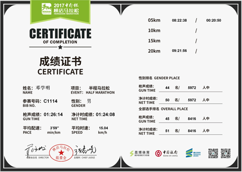 四月的江南,烟雨朦胧,春意盎然。公司邓学明老师在这美丽的季节分别参加了两场马拉松比赛,并取得了优异的成绩。4月9日参加了2017“中行杯”横店马拉松男子半程比赛,枪响成绩1小时26分14秒,在5972名参赛选手中位列44名;净成绩1小时24分08秒,在5972名参赛选手中位列50名。4月23日参加了2017扬州鉴真国际马拉松男子半程赛,枪响成绩1小时22分13秒,在9764名参赛选手中位列57名;净成绩1小时22分05秒,在9764名参赛选手中排名58。值得庆贺的是这成绩在46岁到50岁的1768名参赛男子选手中排名第3,在有2012名选手参加的中国梦排名第10。