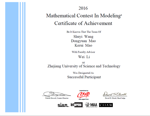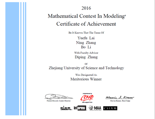 4月12日,从美国老员工数学建模竞赛与交叉学科数学建模竞赛(MCM/ICM)网站传来喜报,由yl23411永利官网登录的来越富(15信计)、经管公司的张凝(14财管)、信息公司的李博(14物联网)同学组成的代表队(指导教师:章迪平)获得国际一等奖(Meritorious Winner);另一支由yl23411永利官网登录的王树一(14信计)、毛珂瑞(14信计)、毛冬媛(14应用物理)同学组成的代表队(指导教师:李蔚)获得国际三等奖(Successful Participant)。