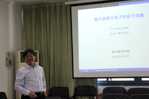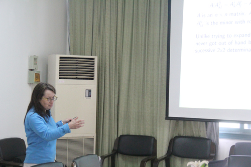 Claire Gilson教授作了“Dodgson Condensation, Pfaffians and Quasi-determinants”的学术报告;胡国恩教授作了稀疏算子与A2猜想”和“非标准Calderon-Zygmund算子的加权常数估计”的报告报告;张璞教授作了极大函数交换子的若干问题的报告。报告中各位专家分别就相关的专业领域做了报告,并跟与会的老师做了进一步的学术探讨。