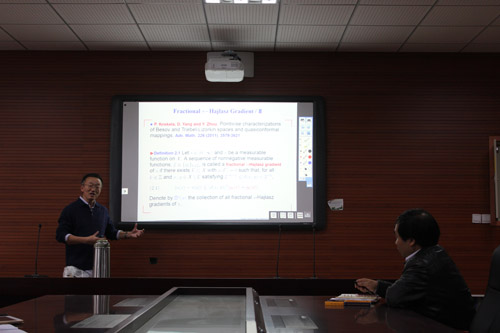 11月12日,教育部“长江学者”、北京师范大学杨大春教授应邀做客和山数学论坛第81讲,做了题为“度量测度空间上的索伯列夫空间”的学术报告。活动由校学科带头人、yl23411永利官网登录经理陶祥兴教授主持,公司部分教师参加了本次活动。