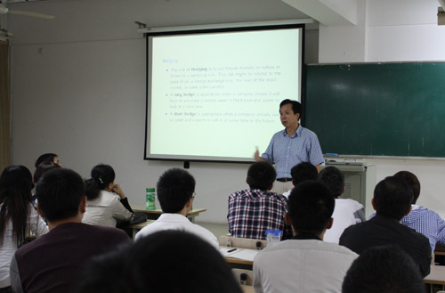 报告中,吴志坚教授首先引入并介绍了期货合约的概念,并以现实生活中常碰到的人身保险、汽车保险为例,指出研究期货最优策略的必要性。吴教授还通过图示和数学模型的推理计算,讲解了最佳对冲交易值的确定问题,并阐述了他和团队成员利用短期期货调控长期投资风险的最新研究成果。最后,他强调了数学理论在实际案例应用中的指导作用,并提出了金融数学中富有挑战性的研究问题供在座师生思考。