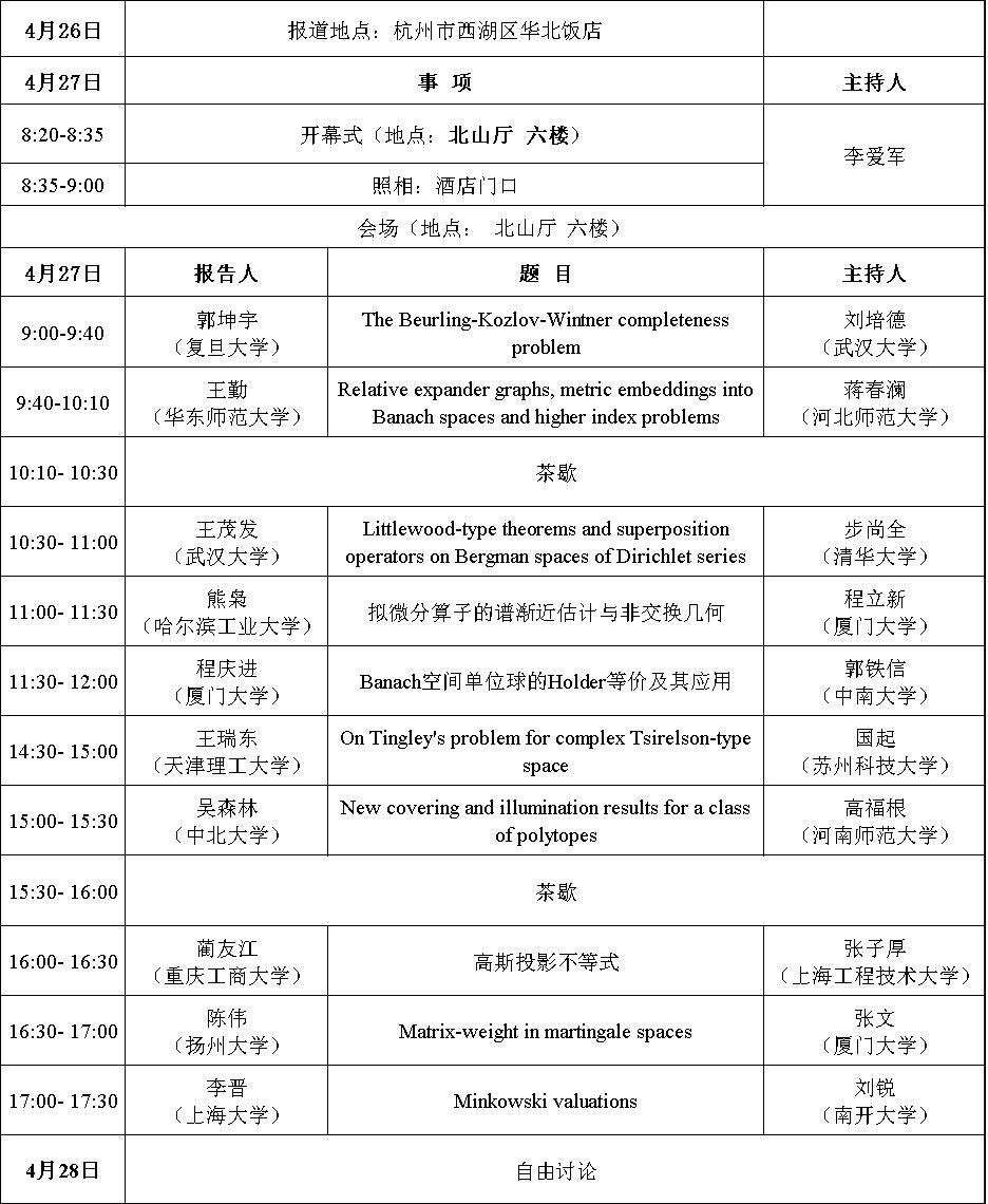 2024年4月26日至4月28日在杭州市华北饭店举办“2024年泛函分析与几何研讨会”,本次会议由yl23411永利官网登录承办,主要交流Banach空间理论、算子理论与几何及其相关领域的最新研究成果和前沿进展,加强同行间的交流与合作。