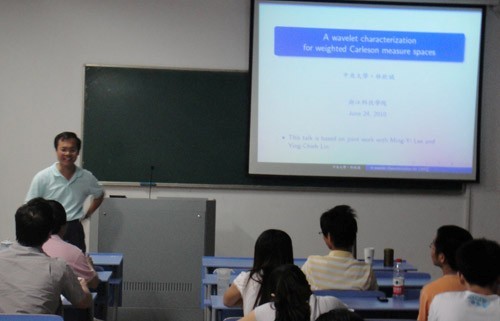 6月24日,由校学科带头人、公司陶祥兴教授主持的应用数学学术系列活动——和山数学论坛第13讲在闻理园A3-110举行。来自台湾中央大学数学系博士生导师林钦诚教授为公司师生做了题为“加权卡尔森测度空间的小波特征刻画”的学术报告。
